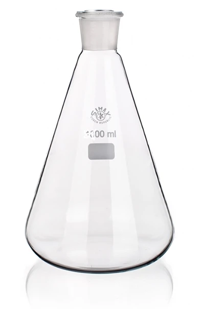 Большая коническая колба Эрленмейера, емкостью 3 л. Особенности конструкции: стеклянная прозрачная колба коническая, с горловиной со шлифом 45/40 и плоским дном. Очень устойчивая форма с широким основанием, уменьшающимся к верху, делает колбу одним из самых популярных сосудов в лабораториях. Горловина со шлифом 45/40 позволяет герметично укупоривать изделие, например, для временного хранения приготовленного раствора. На стенках колбы есть прямоугольник для карандашных отметок и шкала для ориентировочного определения объема жидкости.