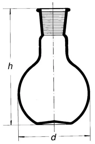 Колба с плоским дном и особенно тщательно пришлифованной горловиной. Круглая, термостойкая. Материал колбы, боросиликатное стекло, не провоцирует никаких химических реакций, поэтому химическая посуда из него может использоваться для кислот и соляных растворов. Стекло умеренно стойко к щелочи.
