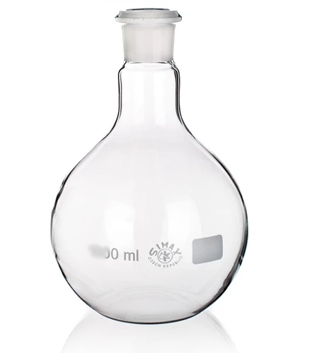 Круглая колба из боросиликатного, стойкого к коррозии стекла. Термостойкая, с плоским дном и особенно качественным шлифом. Может использоваться для химически активных жидкостей. Не желательно подвергать частой смене щелочных и кислотных сред.