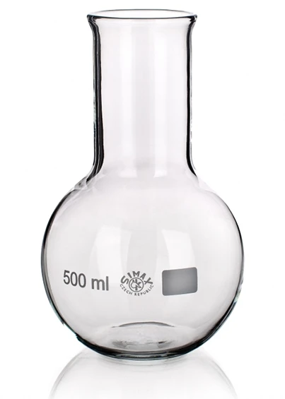 Круглая лабораторная колба с плоским донышком и широким горлом. Для большей прочности и удобства при использовании колбы на ее горловине имеется ободок-расширение. Колба емкостью 250 мл может использоваться как приемник при перегонке, сосуд для смешивания жидкостей, для органического синтеза и многих других аналитических работ.