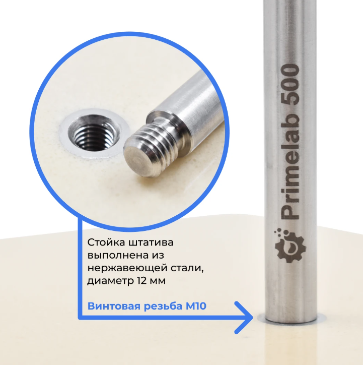 Стойка длиной 500 мм выполнена из нержавеющей стали диаметром 12 мм и снабжена стандартной винтовой резьбой для надёжного крепления к основанию. Такая высота оптимальна для большинства повседневных лабораторных задач — от фильтрации до установки стеклянных ёмкостей среднего размера.