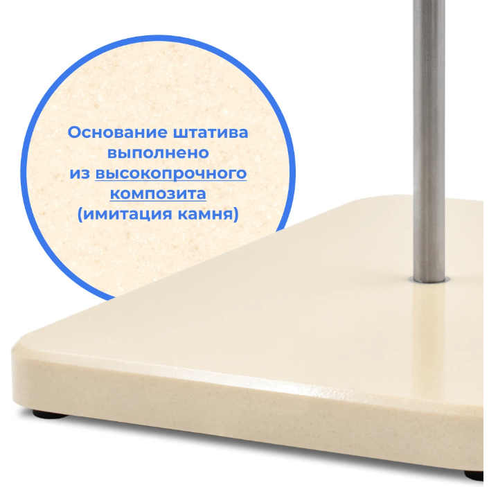 Оснащен прочной платформой из композитного материала, имитирующего камень, который отличается высокой стойкостью к химическим веществам и механическим повреждениям. Благодаря размерам основания 300х190х25 мм, сохраняет устойчивость даже при асимметричных нагрузках.