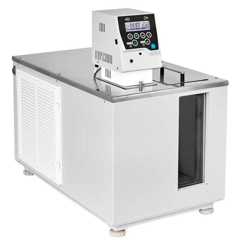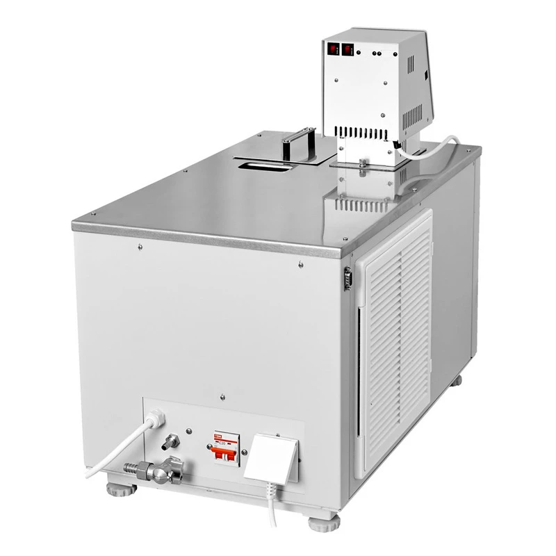 Основу конструкции составляет ванна для заполнения теплоносителем. Встроенный циркуляционный насос, охладитель и нагреватель обеспечивают точное поддержание заданной пользователем t в любой точке ванны. Управление всеми устройствами осуществляется микропроцессорным блоком на основании сигналов термодатчиков.