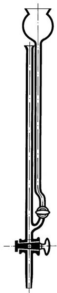 Микробюретка объемом 5 мл представляет собой тонкую трубочку из светлого боросиликатного стекла. С одного конца снабжена тонким стеклянным носиком и запорным стеклянным краном. Имеет отвод с дополнительным верхним резервуаром для быстрого наполнения жидкостью. Отвод также снабжен стеклянным запорным краном.