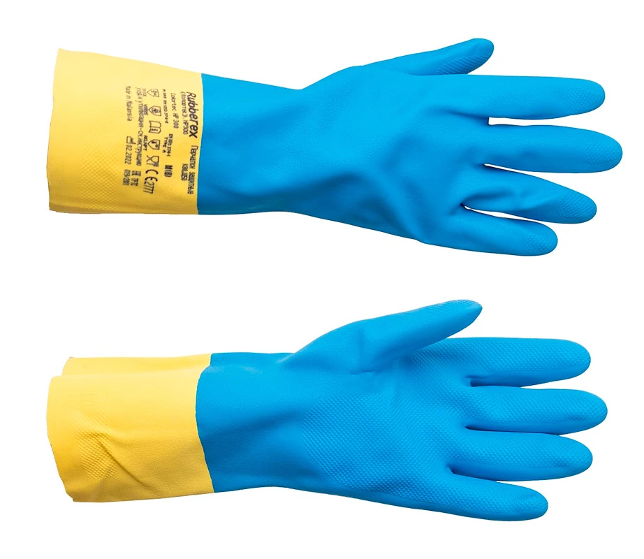 Перчатки изготовлены из смеси неопрена с латексом. Внутренний слой из хлопкового напыления с бактерицидной обработкой защищает от пота и раздражения. Рифленая поверхность на ладонях и пальцах обеспечивает прочный захват и комфортную работу с влажными и скользкими инструментами или сосудами. Длинная манжета надежно защищает кожу и одежду.