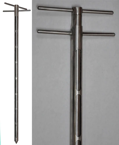 Внутренний стержень разделен на 8 отсеков (вы можете заказать пробоотборник с любым количеством отсеков), вдоль каждого отсека с одной стороны имеется отверстие для забора проб. Внешний стержень имеет отверстия такого же размера. Для забора проб инструмент в закрытом состоянии опускают в емкость на нужную глубину, потом отсеки открывают, наполняют, снова закрывают. После этого пробоотборник извлекают.