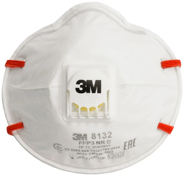 Респиратор фильтрующий 3M 8132 FFP3 с клапаном выдоха обеспечивает защиту от аэрозлей до 50 ПДК — об этом свидетельствуют резинки красного цвета.