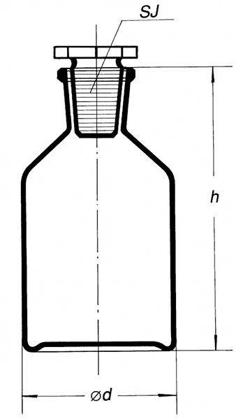 Склянка светлая, лабораторная, полулитровая. Состоит из стеклянного флакона с притертой горловиной и стеклянной пробки с пришлифованным керном. Особенность конструкции склянки: узкая горловина, шлиф 24/29. Высота склянки 163 мм — лишь вдвое превышает диаметр 85 мм, поэтому сосуд достаточно устойчив на столе.