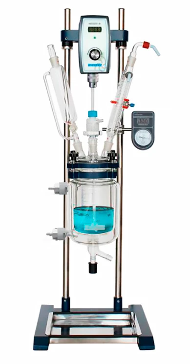 • двуслойный двухлитровый резервуар позволяет регулировать температуру реакционной смеси в диапазоне от -80 до +200 °С (подача теплоносителя от внешнего источника);