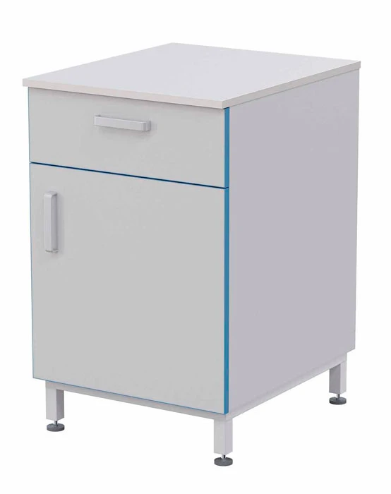 Тумба с ящиком и отделением с полкой и дверцей подходит для хранения инструментов, коробок с образцами, других необходимых для работы предметов. На столешнице можно разместить габаритный прибор, например, принтер, магнитную мешалку или весы.