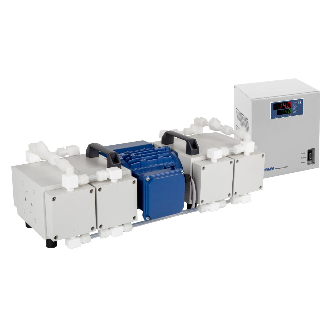 Насос оснащен защитой от перегрева: если температура превышает допустимый уровень, насос автоматически отключается и возобновляет работу после остывания. Для удобства управления уровень вакуума можно регулировать вручную с помощью клапана или вакуумного контроллера, что позволяет точно настроить параметры под конкретные задачи.